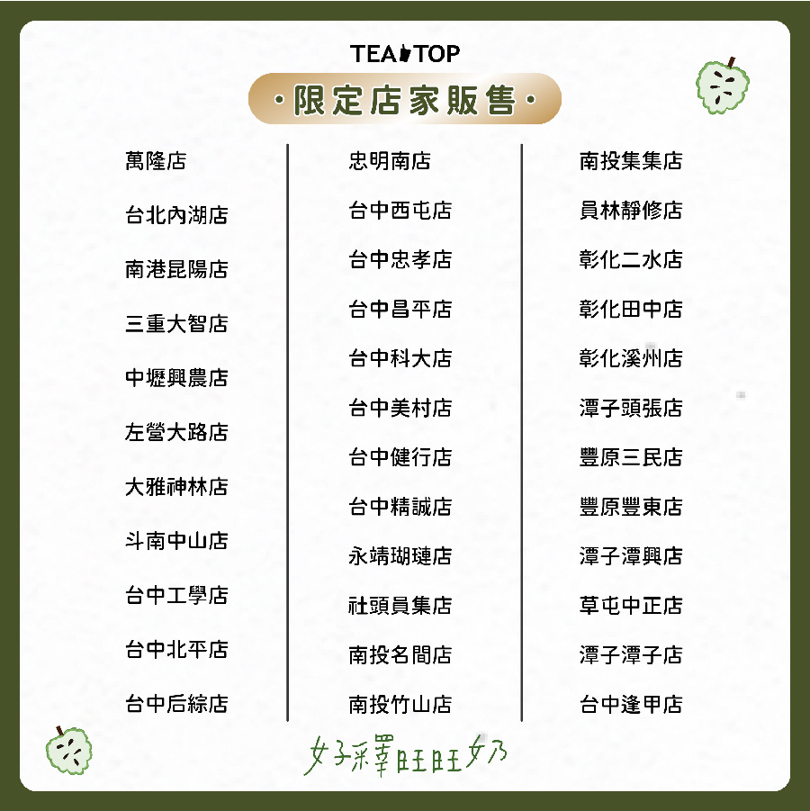 除此之外,以有自己的茶廠、使用台灣在地新鮮水果聞名的TEA TOP第一味,今年夏天也與農糧署合作,選用香甜微酸,口感細緻Q 彈的台東鳳梨釋迦,搭配台東在地小農鮮乳,推出「好釋旺旺奶」冰沙,口感綿密又能品嚐台灣在地鳳梨釋迦的完美風味,是冰涼消暑的好選擇。