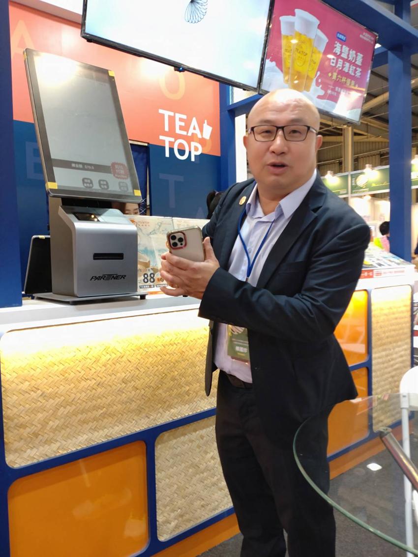 ▲「TEA TOP第一味」執行長楊國珍21日在台中連鎖加盟展中,展出最新推出的無人點餐系統。圖/曾麗芳