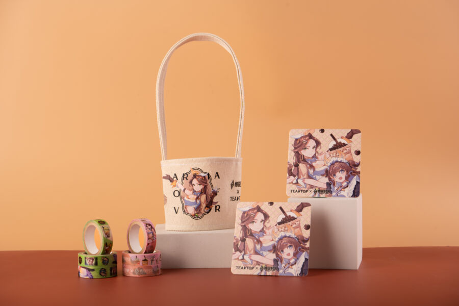 圖/TEA TOP聯名傳說對決推出三款周邊商品,包含紙膠帶、紙杯墊和飲料提袋。(TEA TOP 提供)