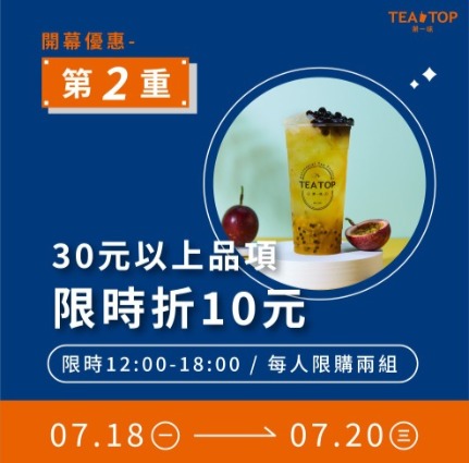 30元以上飲品限時折10元/限時12:00-18:00、每人限2組、限大杯、來店購買