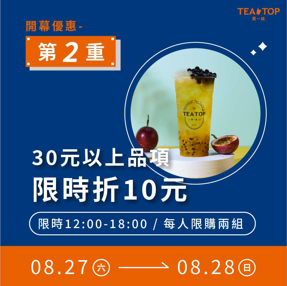 30元以上飲品限時折10元/限時12:00-18:00、每人限2組、限大杯、來店購買