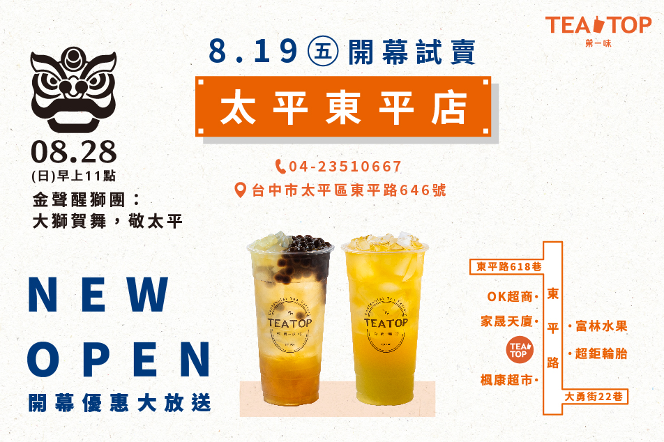 TEA TOP第一味太平東平店8/19盛大開幕囉!!
