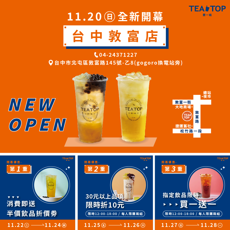 TEA TOP第一味台中敦富店𝟏𝟏/𝟐𝟎盛大開幕囉!!