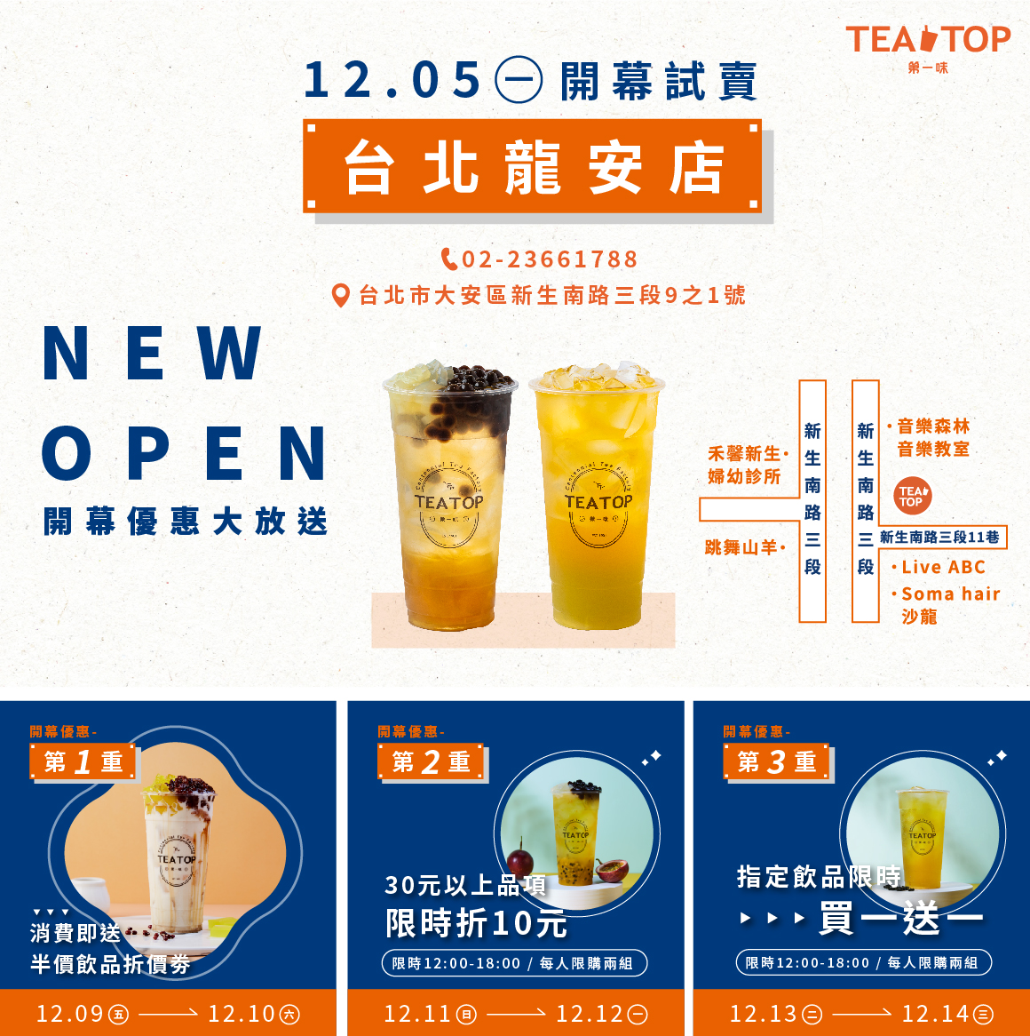 TEA TOP第一味台北龍安店𝟏2/05盛大開幕囉!!