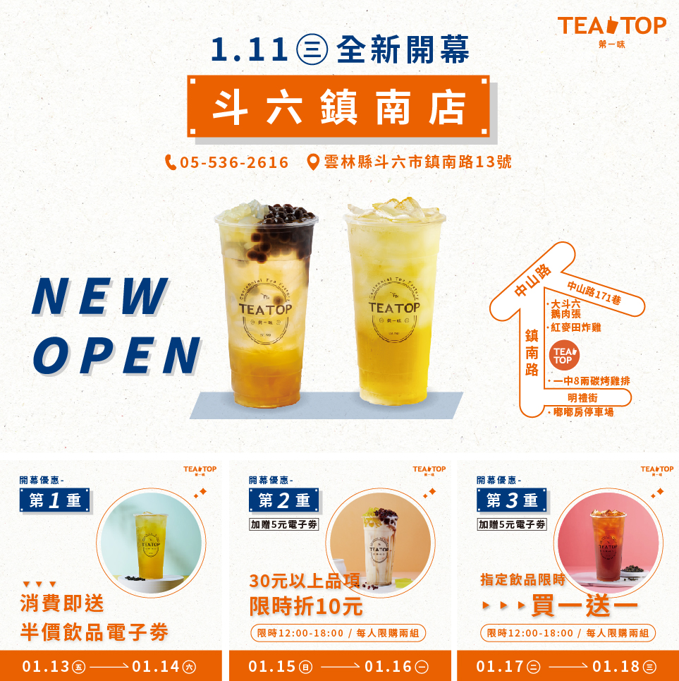 TEA TOP第一味斗六鎮南店𝟐𝟎𝟐𝟑/𝟎𝟏/𝟏𝟏盛大開幕囉!!