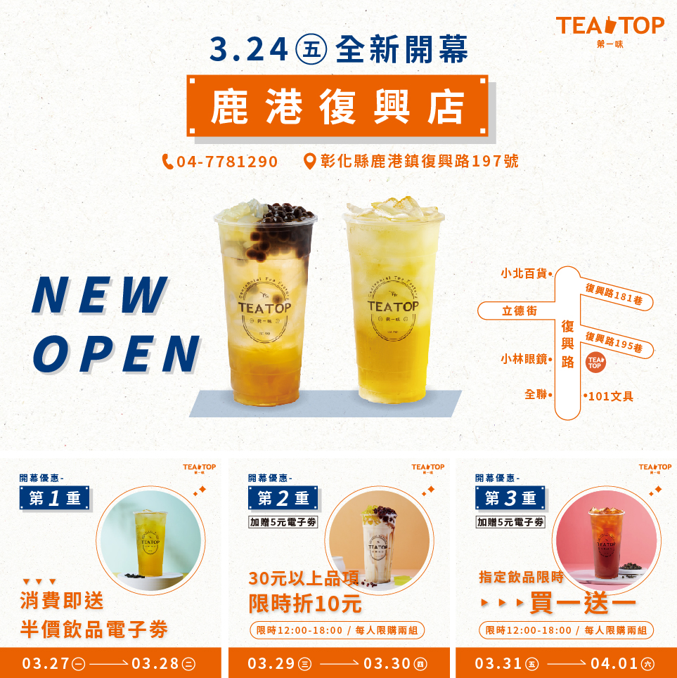 TEA TOP第一味鹿港復興店𝟎𝟑/𝟐𝟒盛大開幕囉!!