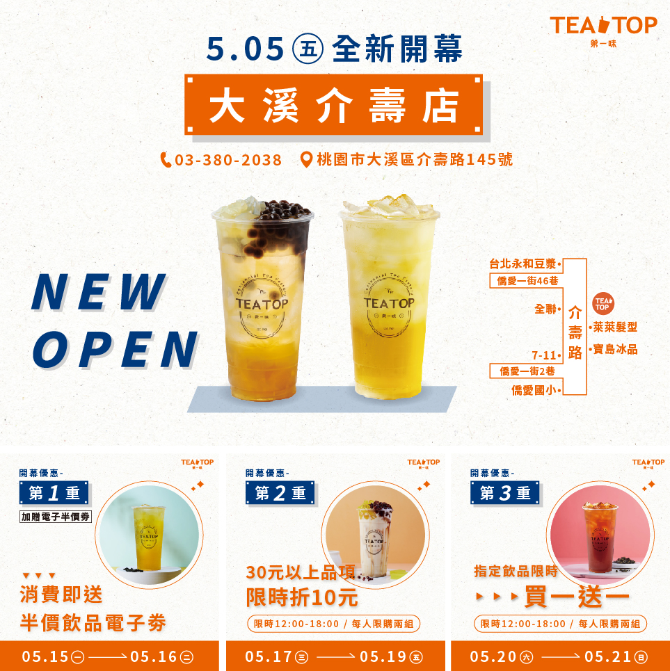 TEA TOP第一味大溪介壽店𝟱/𝟬𝟱盛大開幕囉!!