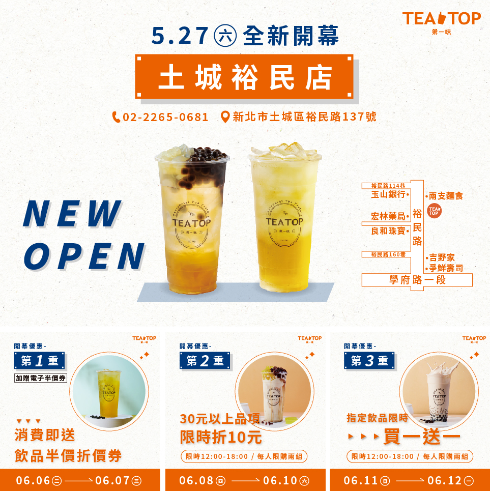 TEA TOP第一味土城裕民店𝟱/𝟮𝟳(六)盛大開幕囉!!