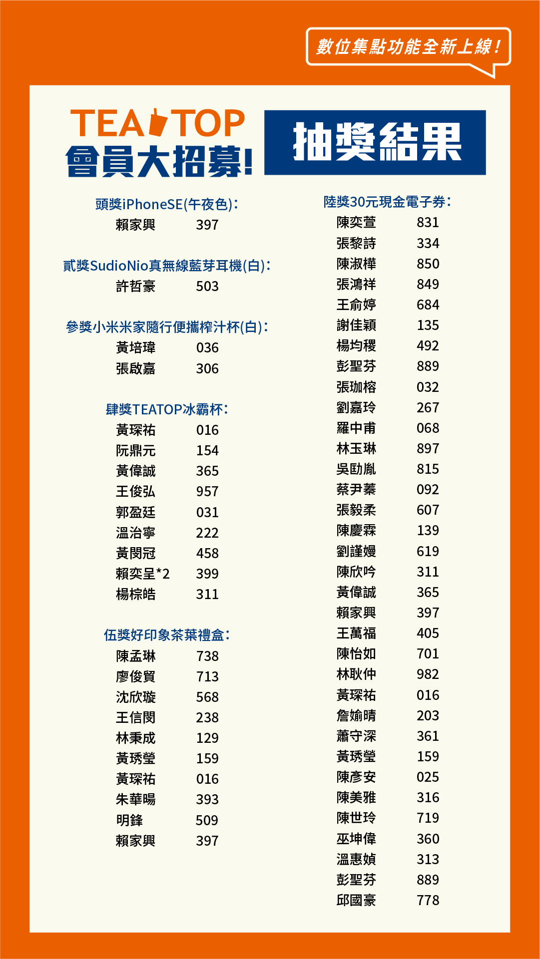 【得獎公告】TEA TOP會員招募抽獎公布🔥