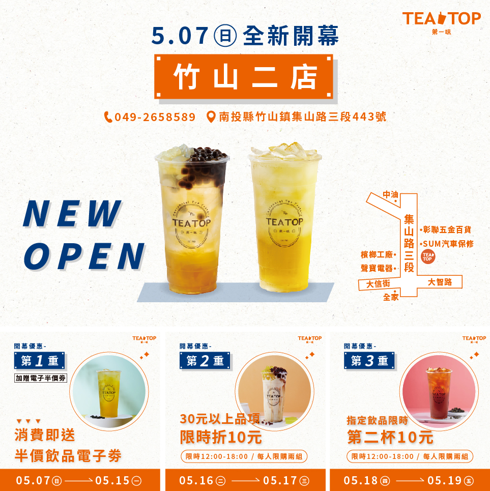 TEA TOP第一味竹山二店𝟱/𝟬𝟳 盛大開幕囉!!