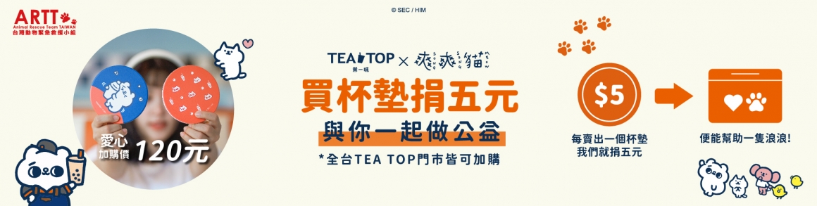 自2022年2月14日起,全台門市消費加購爽爽貓限量款陶瓷吸水杯墊TEA TOP就捐贈「5元」台灣動物緊急救援小組,邀請大家一起攜手做公益。
