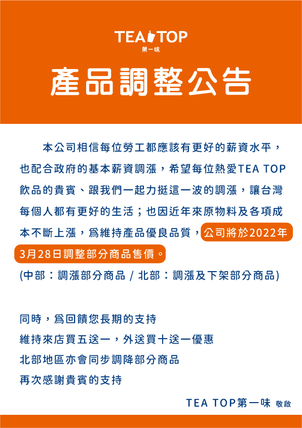 (北/中部) 飲品價格調漲及優惠公告